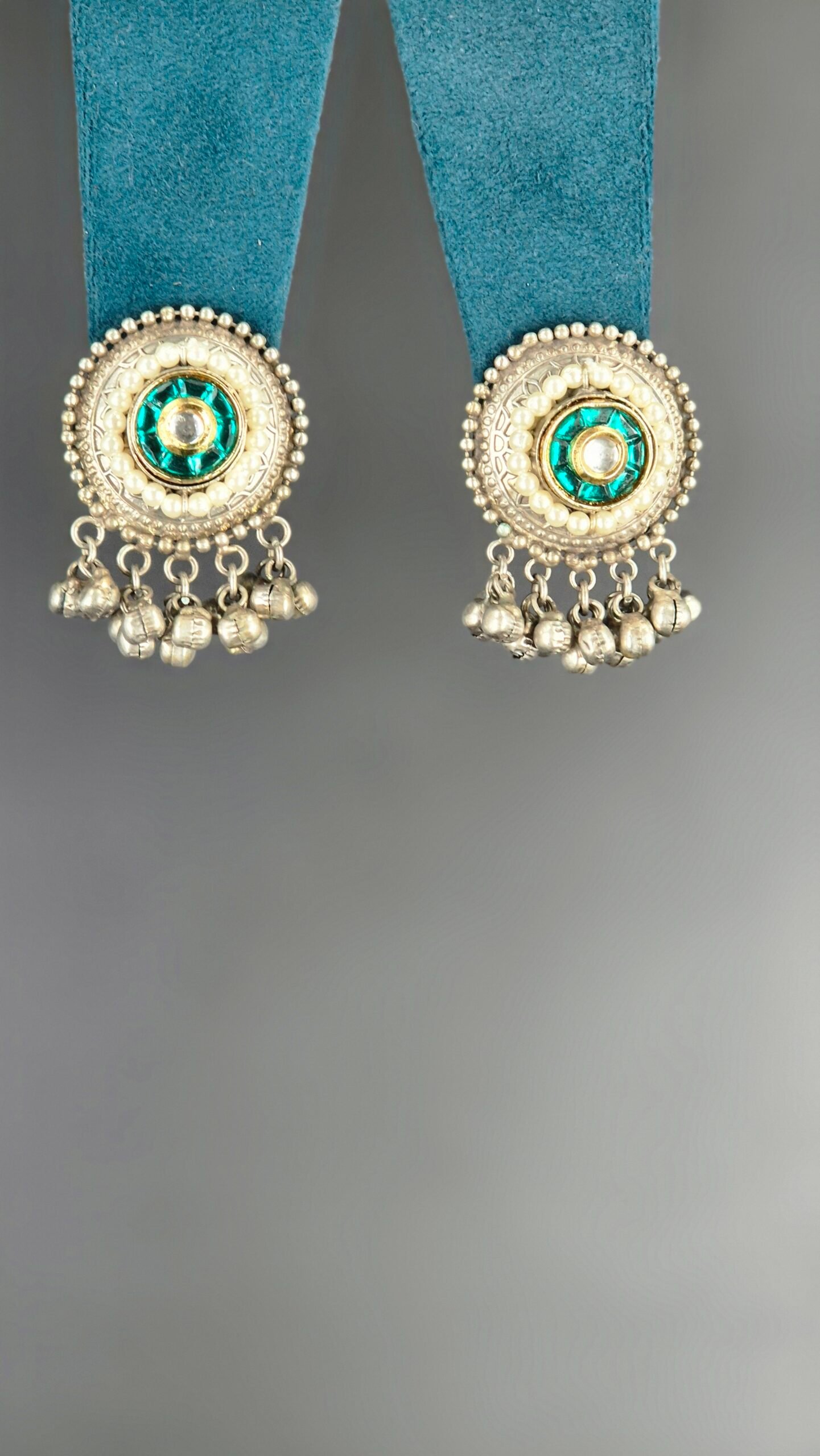 These magnificent Chandrika Earrings are a regal and captivating choice for your Navratri celebrations. The design features a central brilliant green stone, symbolizing prosperity and growth, encased within a circle of luminous white pearls. The entire centerpiece is surrounded by an intricate silver-toned frame with delicate ghungroo (bell) embellishments, adding a playful, rhythmic charm. The detailing on the frame is a testament to traditional craftsmanship, making these earrings an eye-catching statement piece. The cluster of tiny bells hanging below creates a gentle chime with every step, adding a touch of traditional music to your festive look.