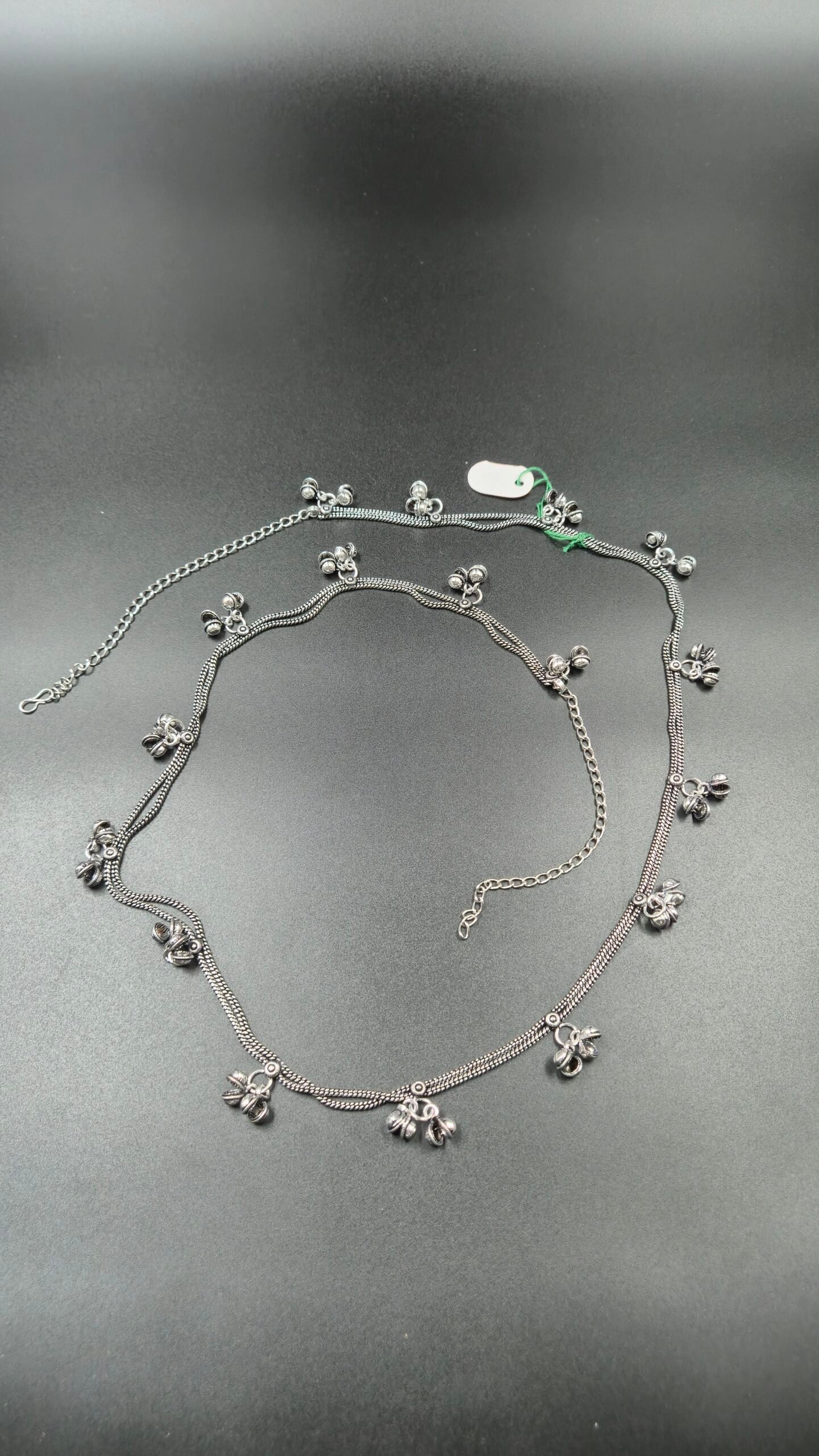Enhance your festive ensemble with this Dual Layer Silver Kamarbandh, designed especially for Navratri. This waist belt features two elegant layers embellished with charming silver bells and floral accents, adding a beautiful rhythmic touch to your movements. The adjustable chain ensures a comfortable fit for all waist sizes, making it ideal for pairing with sarees, lehengas, or any traditional attire. A perfect accessory to highlight your style and grace during Garba nights and Navratri celebrations.