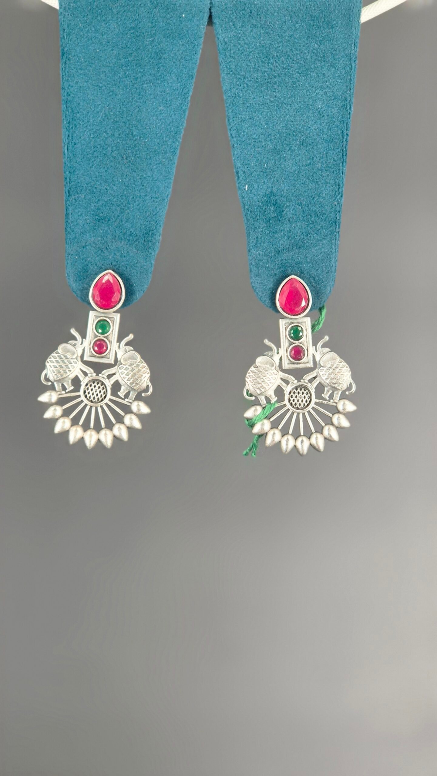These unique Gaja-Surya Earrings are a symbolic and artistic choice for your Navratri celebrations. The design begins with a vibrant top piece featuring a large pink and a smaller green stone, set in a simple silver-toned frame. Below this, two beautifully crafted elephants, symbolizing strength and wisdom, face inward. The lower part of the earring features a semi-circular, sun-ray motif, which represents vitality and light, adorned with small silver beads at the ends. The combination of the auspicious elephant and the powerful sun symbol makes these earrings a meaningful and striking accessory. They are a perfect blend of traditional Indian motifs and a contemporary design, ideal for adding a touch of bold elegance to your festive look.