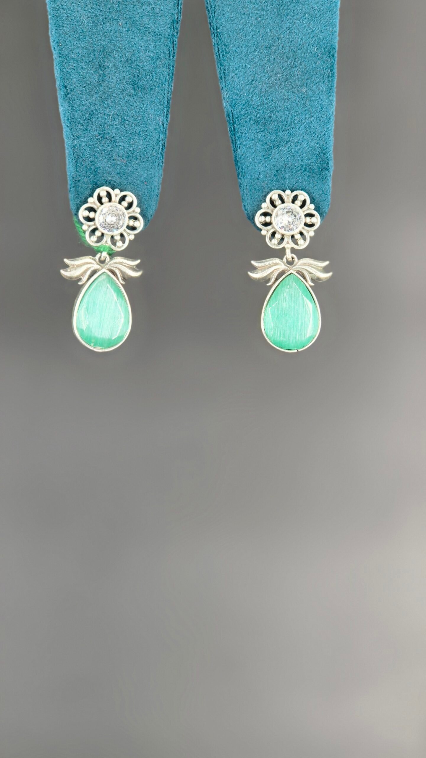 These elegant Garba Green Dangles are a refreshing and beautiful choice for your Navratri festivities. The top features a delicate, floral-shaped stud with a brilliant white stone at its center, surrounded by intricate silver-toned petals. This connects to a stunning, large teardrop-shaped stone in a captivating shade of seafoam green, set in a sleek silver frame. The design is both modern and graceful, with a touch of traditional charm. The vibrant green stone is a symbol of nature and new beginnings, perfect for celebrating the festive season. These earrings are a perfect blend of delicate craftsmanship and bold color, designed to add a touch of fresh sparkle to your festive look. They are lightweight and comfortable, ensuring you can celebrate with style and ease.