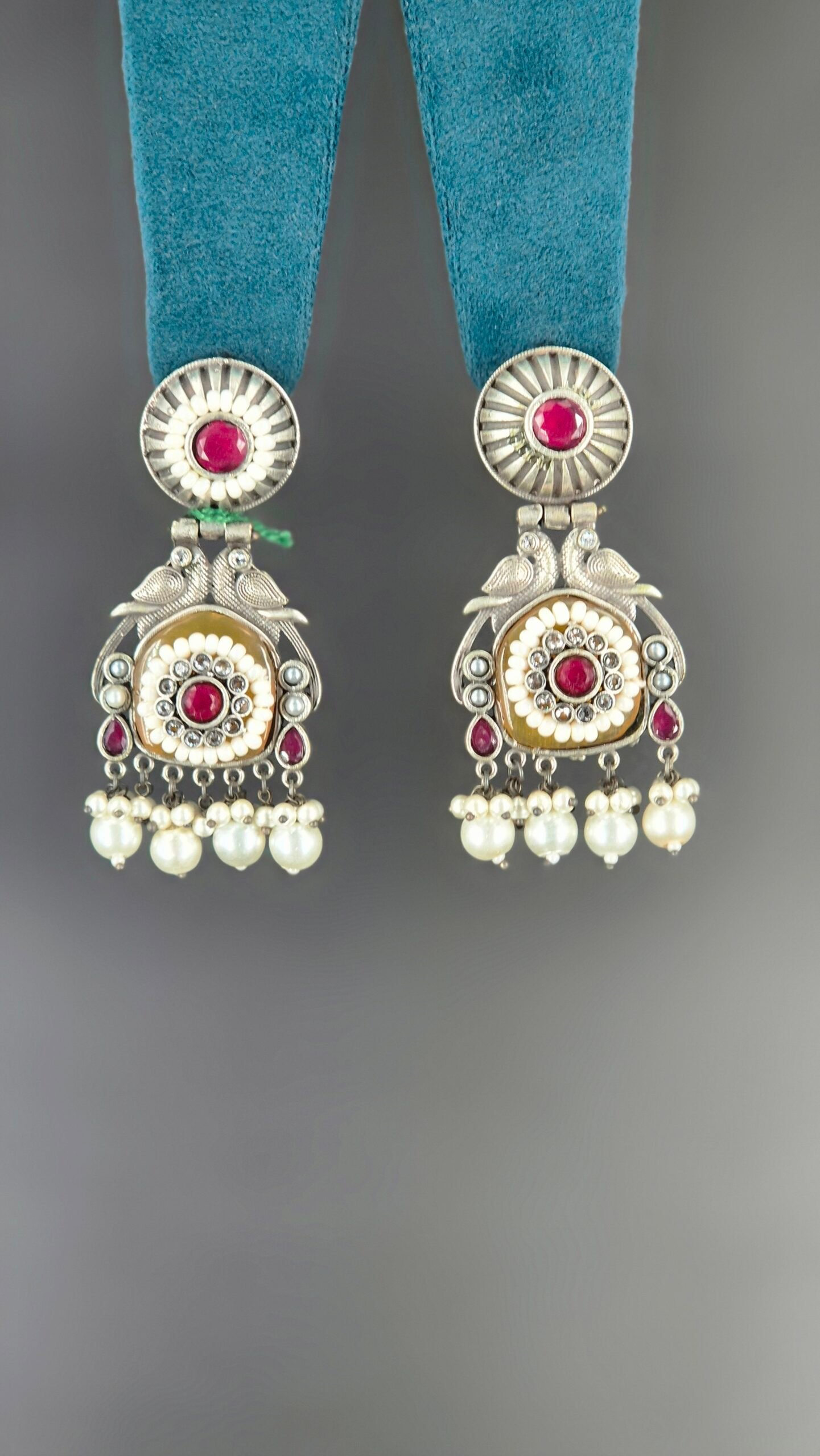 These magnificent Mor Pankh Earrings are a work of art, designed to add a royal and traditional touch to your Navratri attire. The top stud features a bold sun-ray motif with a striking red stone at its center, symbolizing energy and passion. This connects to a beautifully crafted centerpiece that features two intricate peacock figures, a symbol of grace and beauty, on each side. The centerpiece itself holds a central floral pattern with another vibrant red stone surrounded by delicate pearls. From the lower part of the earrings, a series of white pearls and smaller red stones hang, creating a graceful and rhythmic sway. These earrings are a perfect blend of intricate craftsmanship and traditional symbolism, making them a stunning and meaningful accessory for the festive season.