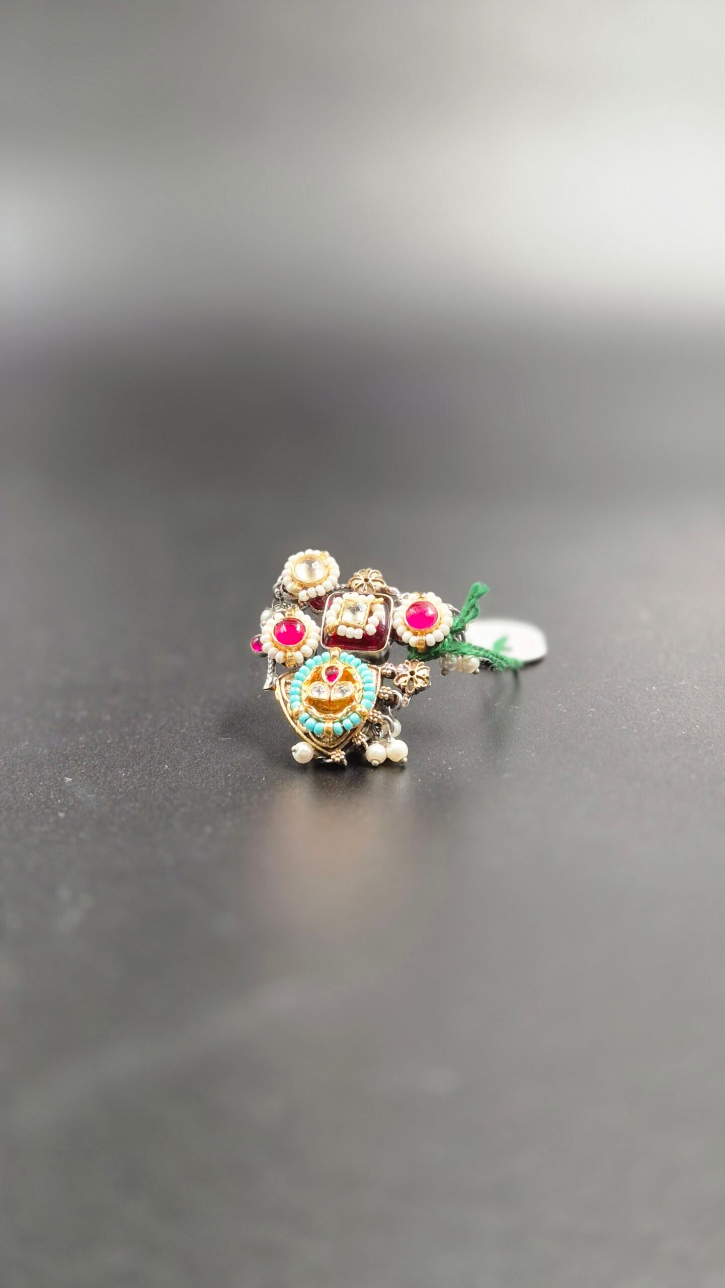 Celebrate Navratri in full bloom with the Garden Bloom Ring, a vibrant cluster-style accessory that captures the joy of the festive season. This delightful ring features multiple floral motifs in bright red, turquoise, white, and gold tones, each adorned with intricate enamel work and sparkling stones. The playful arrangement of flowers with pearl accents creates a charming garden-like effect on your finger, making it the perfect statement piece for Garba and Dandiya celebrations. Wear this ring to add a burst of color and festive cheer to your traditional attire.