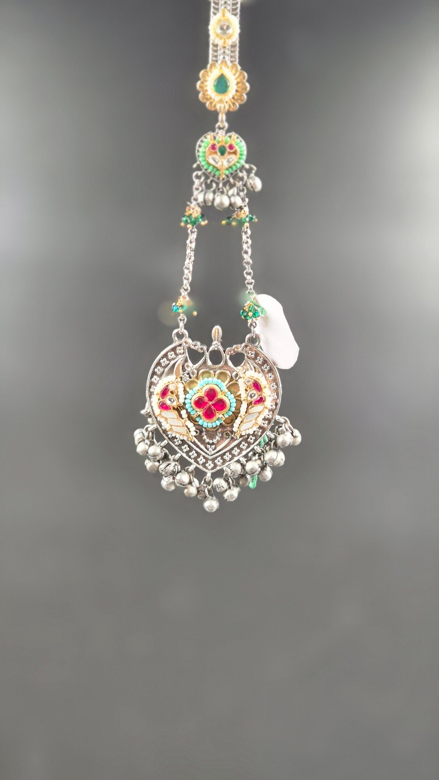Radiate festive joy with the Navratri Heart Charm Kamar Judo, a beautifully designed waist accessory perfect for traditional celebrations. This elegant piece features a heart-shaped pendant adorned with vibrant turquoise, red, green, and gold detailing, and two prominent peacock motifs. The pendant is further embellished with delicate beads and silver bells that add graceful movement as you dance. Intricate chainwork with colorful bead highlights makes it an ideal match for your Garba and Dandiya attire, ensuring you stand out with style and cultural flair during Navratri festivities.