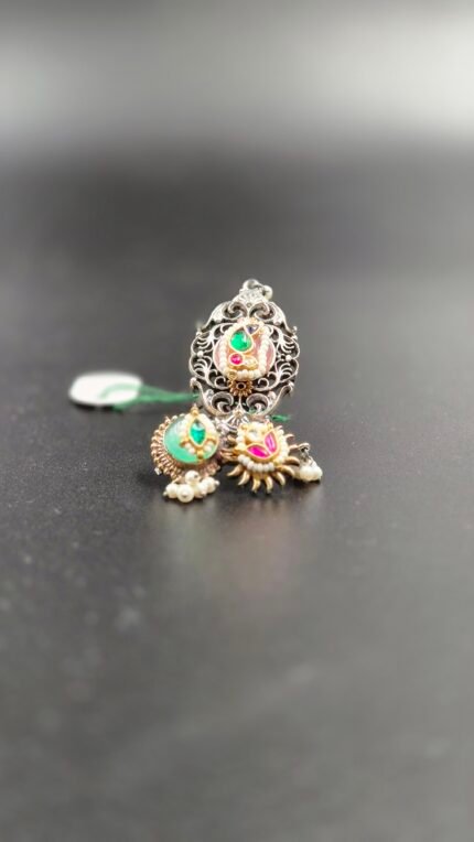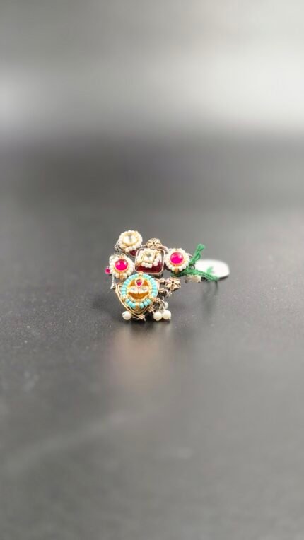 Bring artistry to your Navratri look with the Peacock Glory Ring, a vibrant accessory inspired by peacock motifs and festive elegance. This exquisite ring features an array of paisley shapes and crescent accents, beautifully adorned with pink, green, turquoise, and gold tones, along with pearl drops for added charm. The detailed craftsmanship and multi-colored stones make it the perfect statement piece for Garba and Dandiya nights, adding cultural richness and bright sophistication to your festive attire.