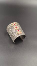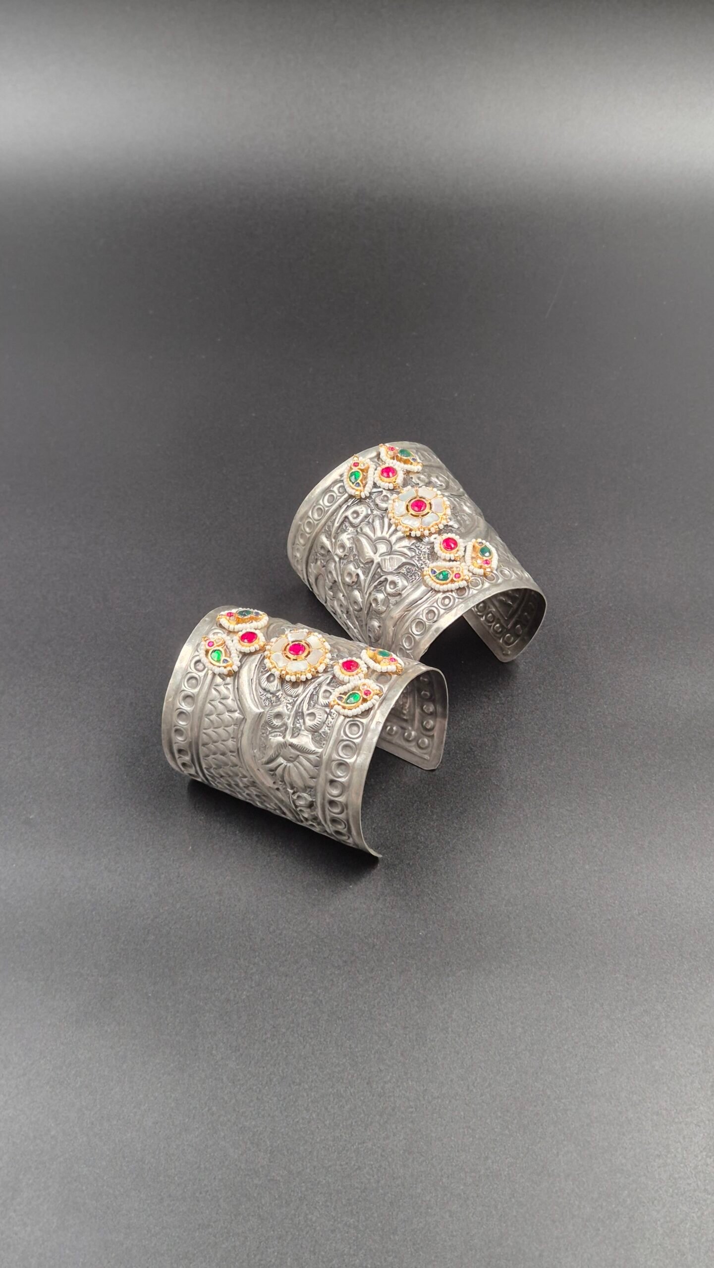 This exquisite pair of sterling silver bangles is a true embodiment of traditional elegance, perfect for the festive spirit of Navratri. Handcrafted with intricate floral and leaf motifs, each bangle features a stunning central design with five colorful stones – vibrant red and green, set in gold-plated circles, symbolizing prosperity and good fortune. The intricate detailing and classic craftsmanship make these bangles a timeless addition to any festive outfit. They are designed to sit comfortably on the wrist, making them ideal for garba and dandiya raas, adding a touch of grace and sparkle to your every move. These “Ridhi-Sidhi” bangles are not just accessories; they are a celebration of heritage and a perfect gift for the modern woman who cherishes tradition.