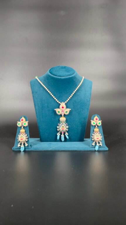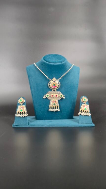 This elegant women’s jewelry set is a perfect blend of modern design and traditional festive colors. The ensemble features a necklace with a delicate, pearl-like beaded chain leading to a large, teardrop-shaped central pendant. The pendant is beautifully adorned with colorful stones in green and red, with a prominent dark-colored, glossy centerpiece. Dangling from the bottom are several vibrant fuchsia-colored beads and small white pearl-like beads, creating a striking and graceful effect. The matching earrings echo the design of the pendant, featuring a similar shape with the same colorful stones and a single, dangling fuchsia-colored bead. This set’s unique and bold color combination makes it a stunning accessory for any festive occasion.