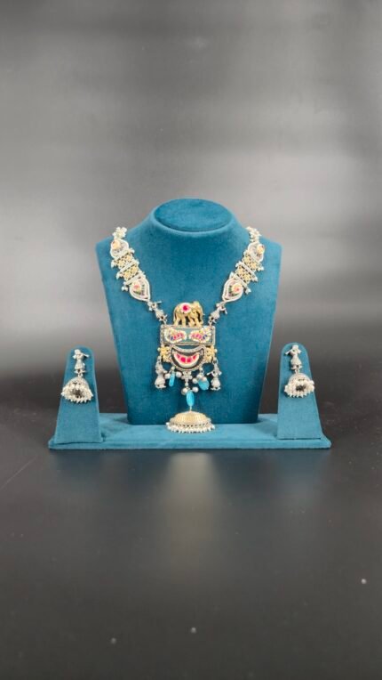 This elegant women’s jewelry set is a beautiful fusion of classic design and traditional motifs. The set features a stunning necklace with a beaded silver-toned chain, which leads to a central pendant. The pendant is a large, ornate piece with an intricate design at its center, surrounded by colorful stone accents in red and green, and further embellished with clusters of small, dangling pearl-like beads. Completing the set are the matching earrings, which are a modern interpretation of the classic jhumka. They feature a similar design to the pendant, with a detailed top section and a tiered base adorned with a fringe of pearl-like drops. The set’s timeless appeal and intricate detailing make it perfect for festive occasions and cultural events.